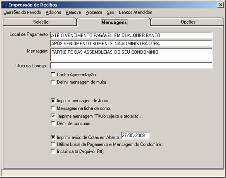 Caixa “Utilizar local de pagamento de mensagens do condominio ” – Quando marcada, imprime no boleto as mensagens gravadas no item: Local de pagamento p/ recibo do menu Impressao de recibos