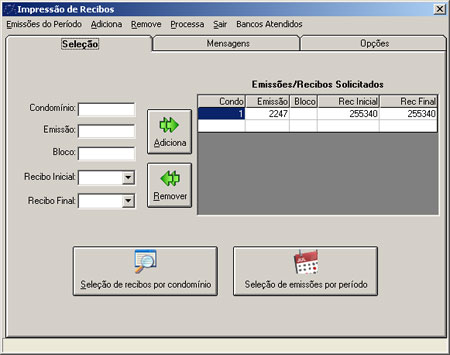 Botão "Seleção de emissões por período " - Pode-se selecionar todos os recibos de vários condomínios do mesmo periodo de vencimento ao mesmo tempo
